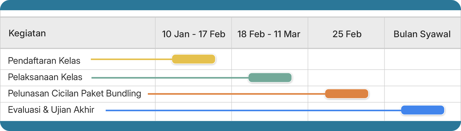 Tidak. Opsi cicilan hanya tersedia untuk paket bundling Kelas Ramadhan. Seluruh kelas satuan wajib dibayarkan lunas di awal saat pendaftaran.